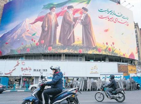 İran’ın başkenti Tahran’ın en işlek meydanlarından birine asılan dev posterde, Ayetullah Humeyni ve Ayetullah Ali Hamaney’in, İran bayrağını Mücteba Hamaney’e teslim ettiği resmediliyor.