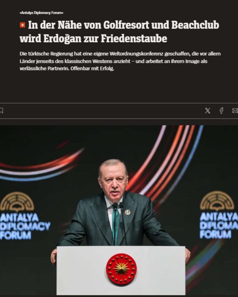 Alman Der Spiegel dergisinin internet sitesinde yayımlanan “Erdoğan barış güvercini oluyor” başlıklı haberde, “Cumhurbaşkanı Recep Tayyip Erdoğan ve Dışişleri Bakanı Hakan Fidan, dünyanın büyük bir kısmının katılımıyla sahnenin domine edildiği, Türk versiyonu Münih Güvenlik Konferansı niteliğinde bir platform oluşturdu” ifadesi yer aldı.