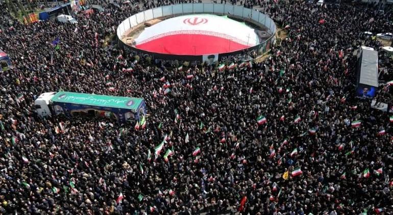 Tahran’daki İnkılap Meydanı’nda Laricani, Süleymani ve 84 asker için düzenlenen cenaze törenine binlerce İranlı katıldı.